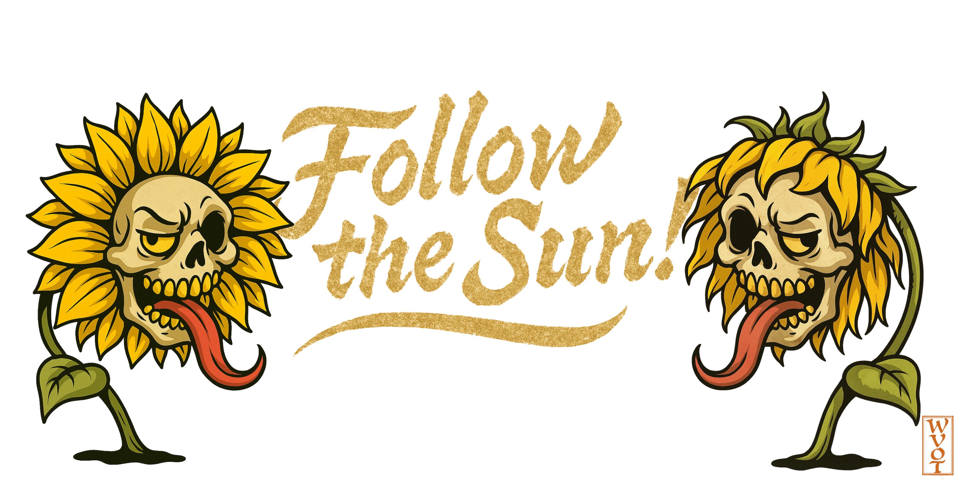 Drop02 delivers a graphic echo of defiance and fragile hope, blending botanical beauty with the macabre. Two sunflowers—each bearing a skull, tongue outstretched—stand as symbols of contradiction: death chasing the sun, and life blooming from the grotesque.